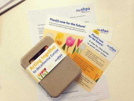 As in our previous campaigns, we have color coded the 6 benefits of heat pumps in a postcard. Together with the postcard, mayors received boxes with 6 tulip bulbs indicating the 6 advantages of HPs: