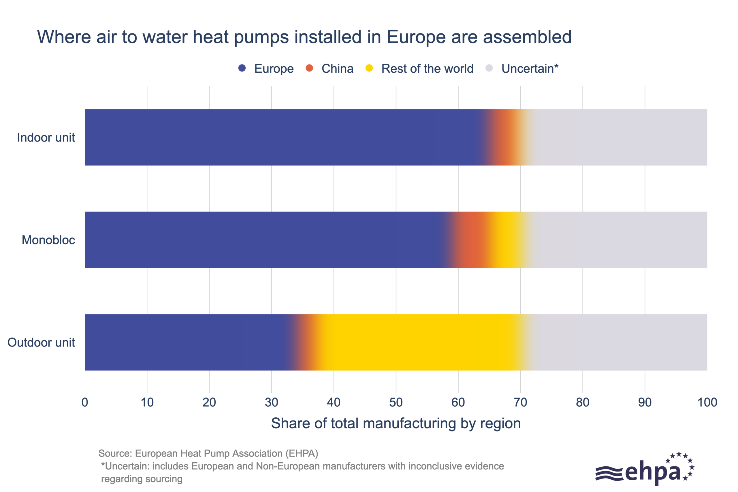 EHPA asked its members where the heat pumps they sold in Europe were manufactured; the captured results represent around 70% of the air to water market. For monoblocs, 80-90% were assembled in Europe against 5-10% in China*. 90-100% of indoor units were assembled in Europe, 5-10% in China. Assembly of these types of units have the highest value-add in the heat pump supply chain. For the outdoor units of the heat pump, around 40-50% were assembled in Europe, under 5% in China, 40-50% elsewhere.