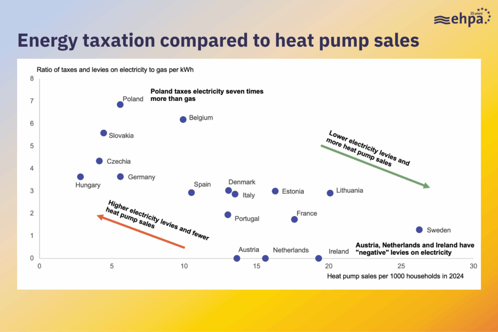 Eight of the 17 European countries examined by EHPA tax electricity at least three times more than gas, and all of them were among the smallest markets for heat pump sales in 2024 relative to their population (see graph).